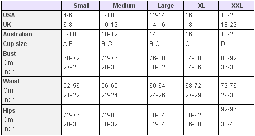 | Bust | 31-33 | 33-35 | 35-37 | 37-39 | 39-41 | 41-43 | 43-45 | 45-47 | 47-49 | 49-51 |